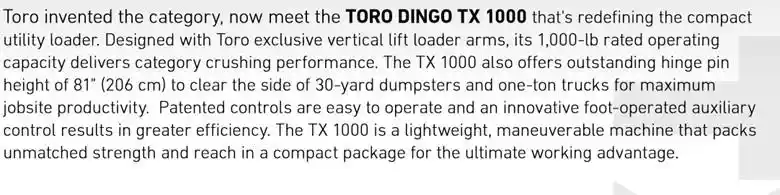 2023 TORO, DINGO TX1000N Skid Steers – Track, TORO 22327, Kubota D1305 diesel, 1000 lbs. ROC, 2857 lbs. tip capacity, 81″” pin height, 5.9″” tracks, 5.6 PSI GP, 34.2″” OAW